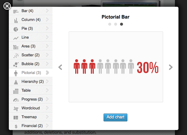 Infogr.am is a website that allows you to make articles. You are given a starting template and are free to add any chart, map, picture, text, or video. There are different options for graphs and texts as well.